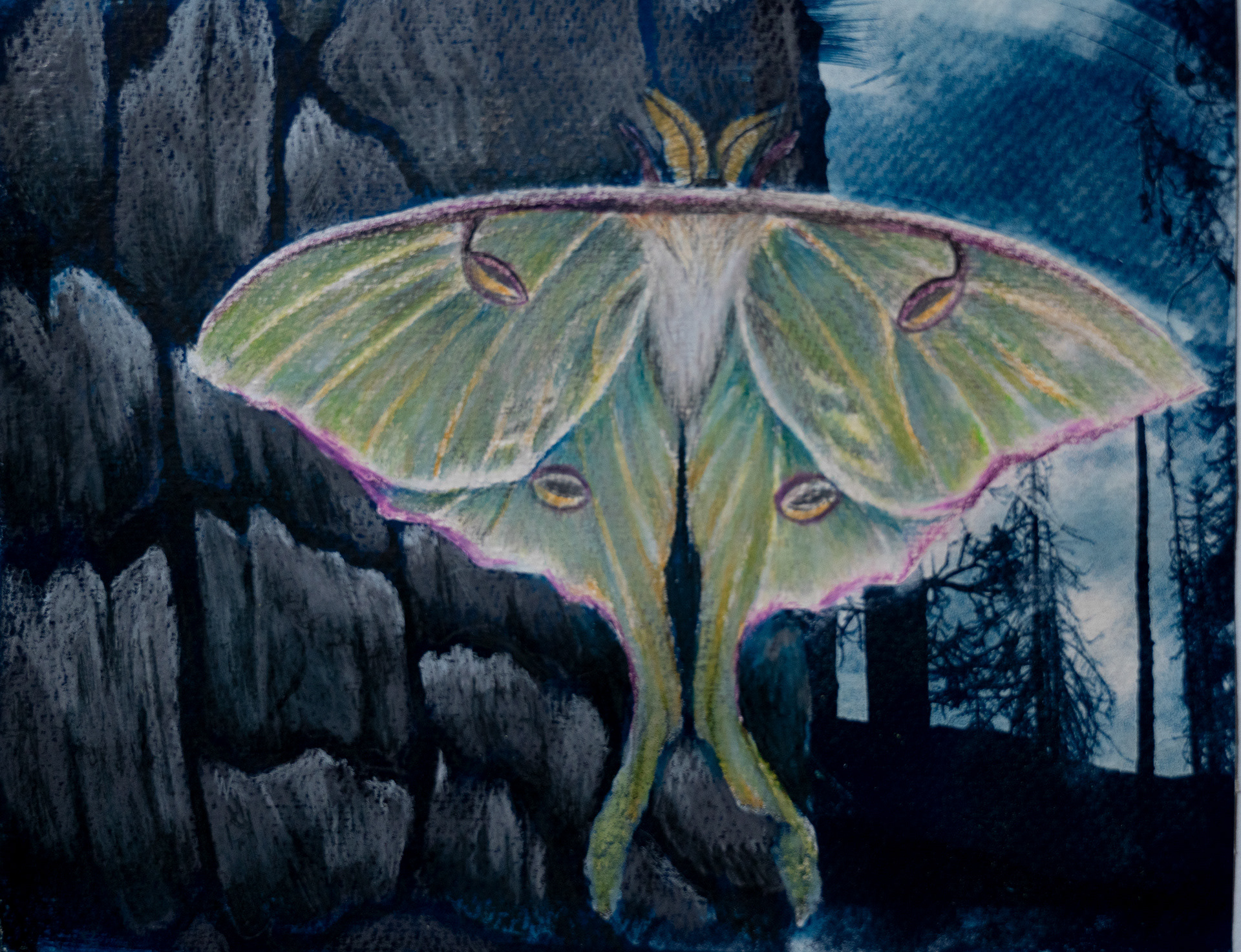 Luna Moth, 2023, Charcoal and Pencil on Cyanotype