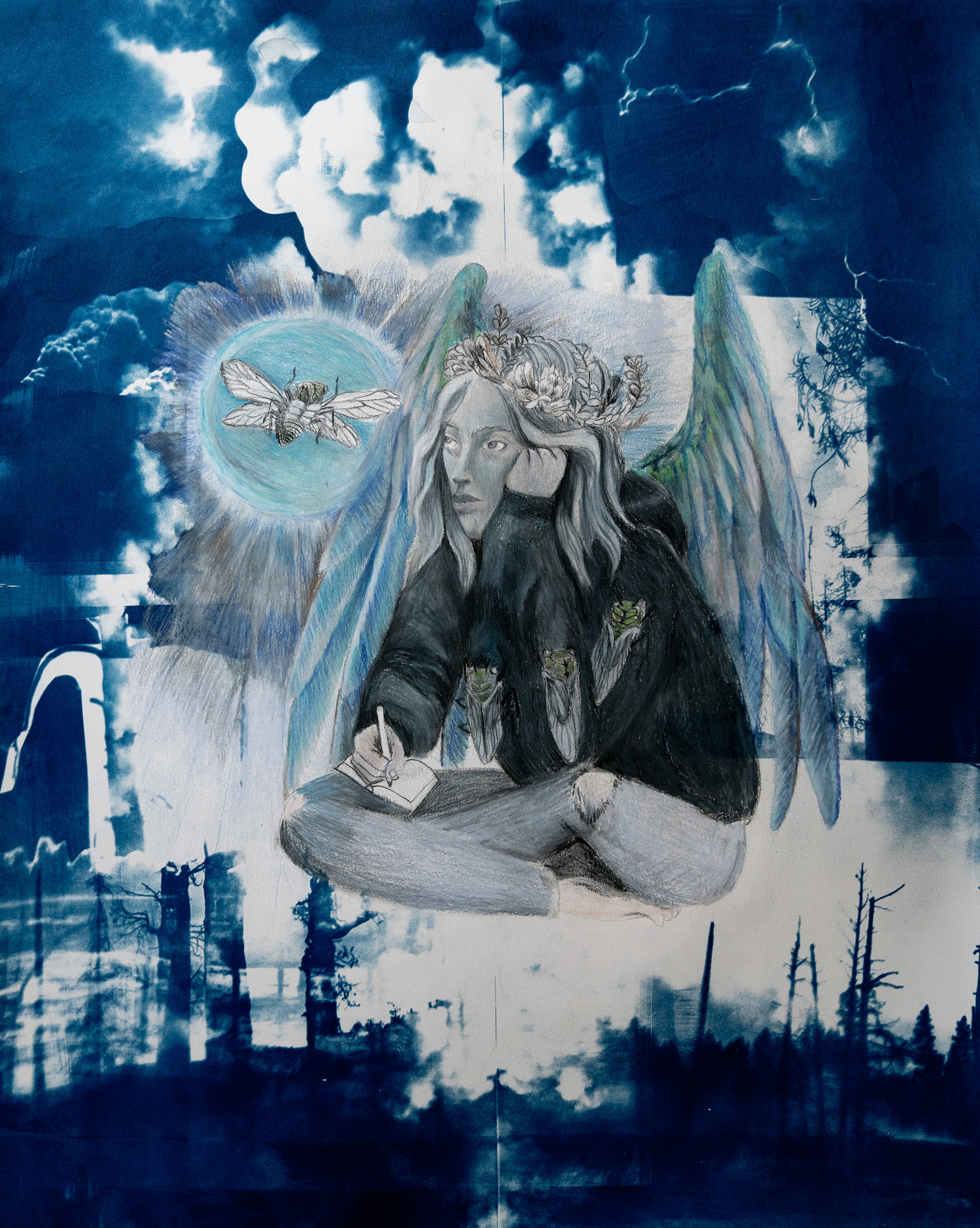 Melancholia and the Magic Cicada, 2023, Pencil and Charcoal on Cyanotype