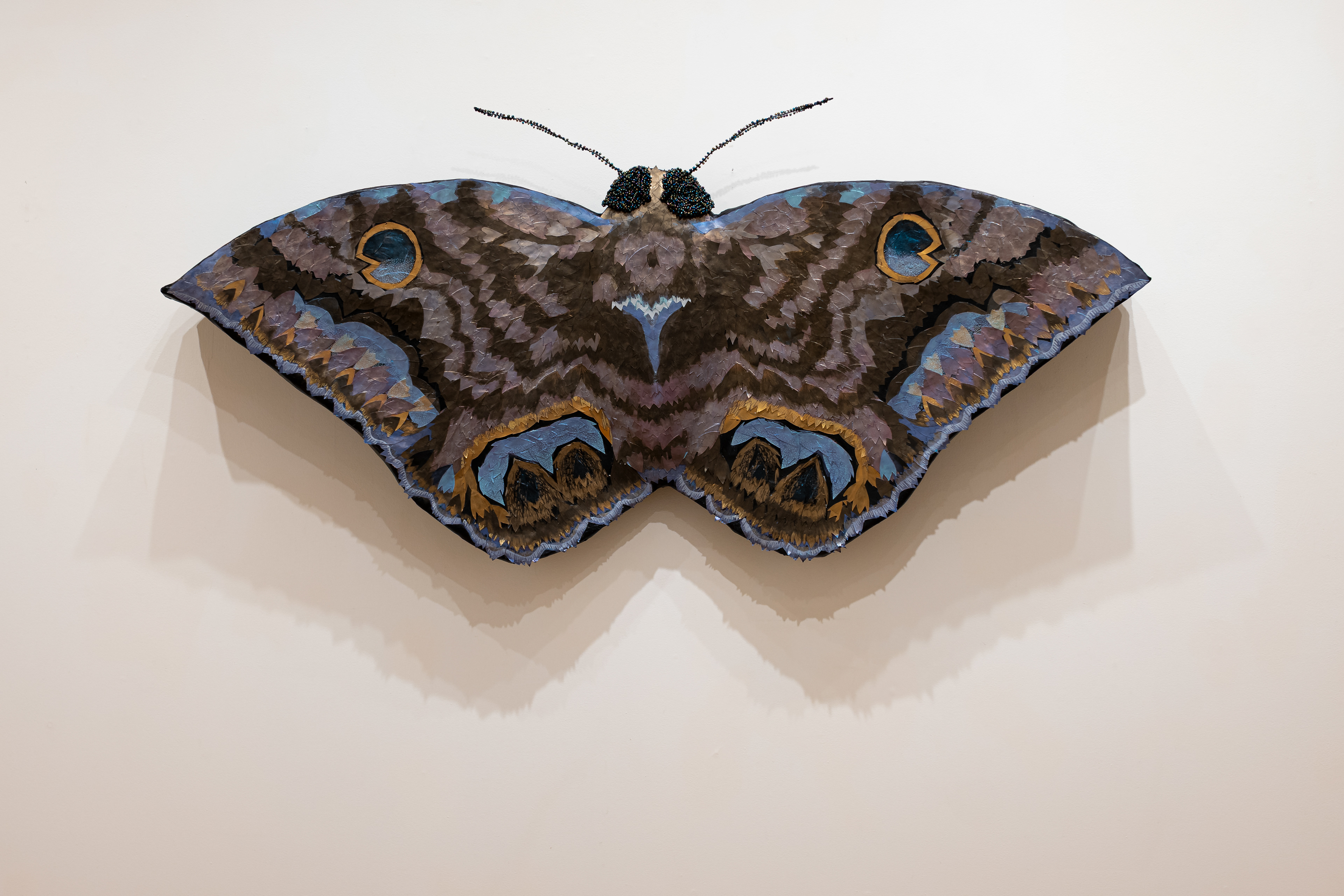 Ascalapha odorata (Black Witch Moth), 2025, Paper Mache, Acrylic Paint, Cardstock, Beads, Wire