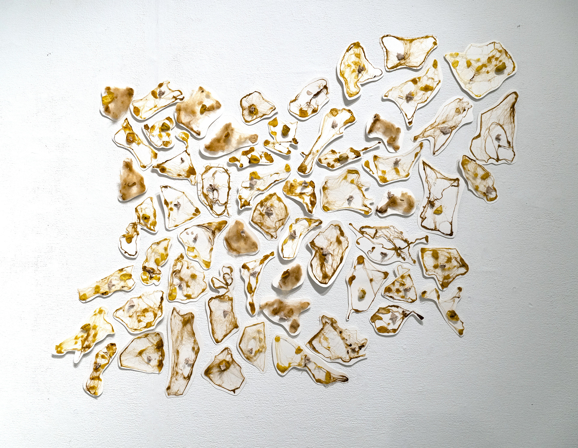 Momento Bombyx mori, 2021, Silk Moths, Silk, Marigold Dye, Thread, Paper