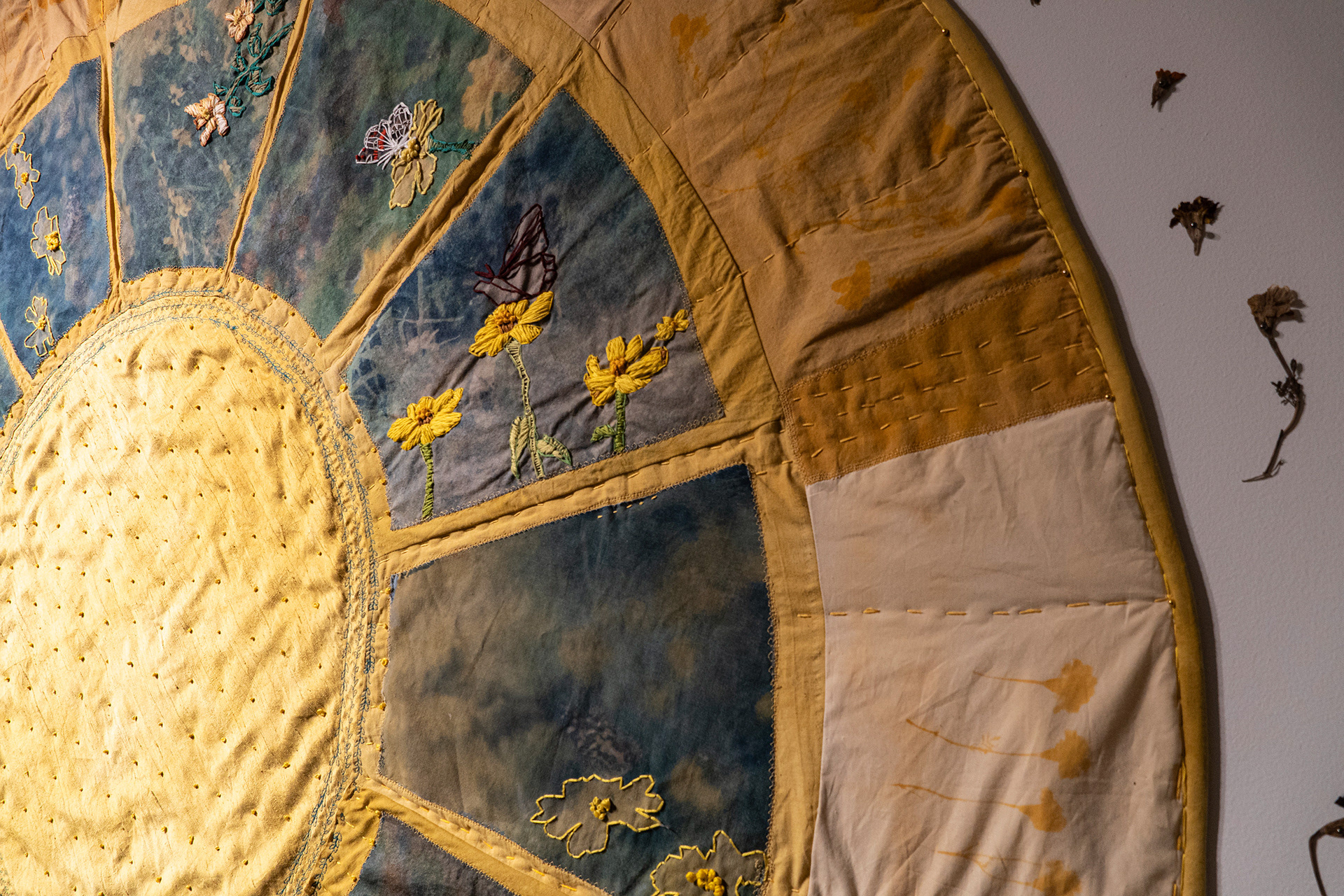 The Language of Flowers, 2021, Silk, Cotton, Gum Bichromate, Marigold Dye, Anthotype, Thread, Batting, Marigolds