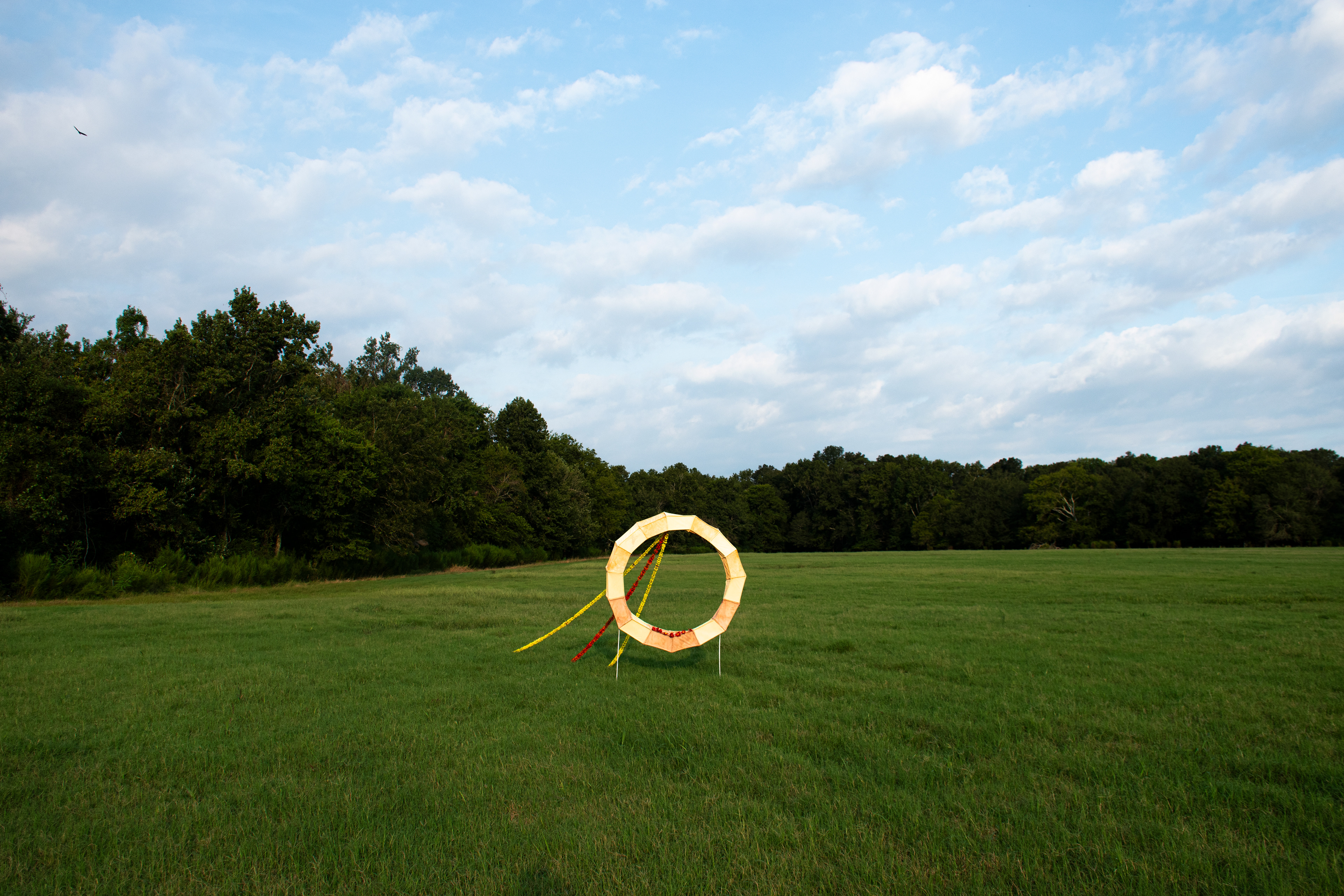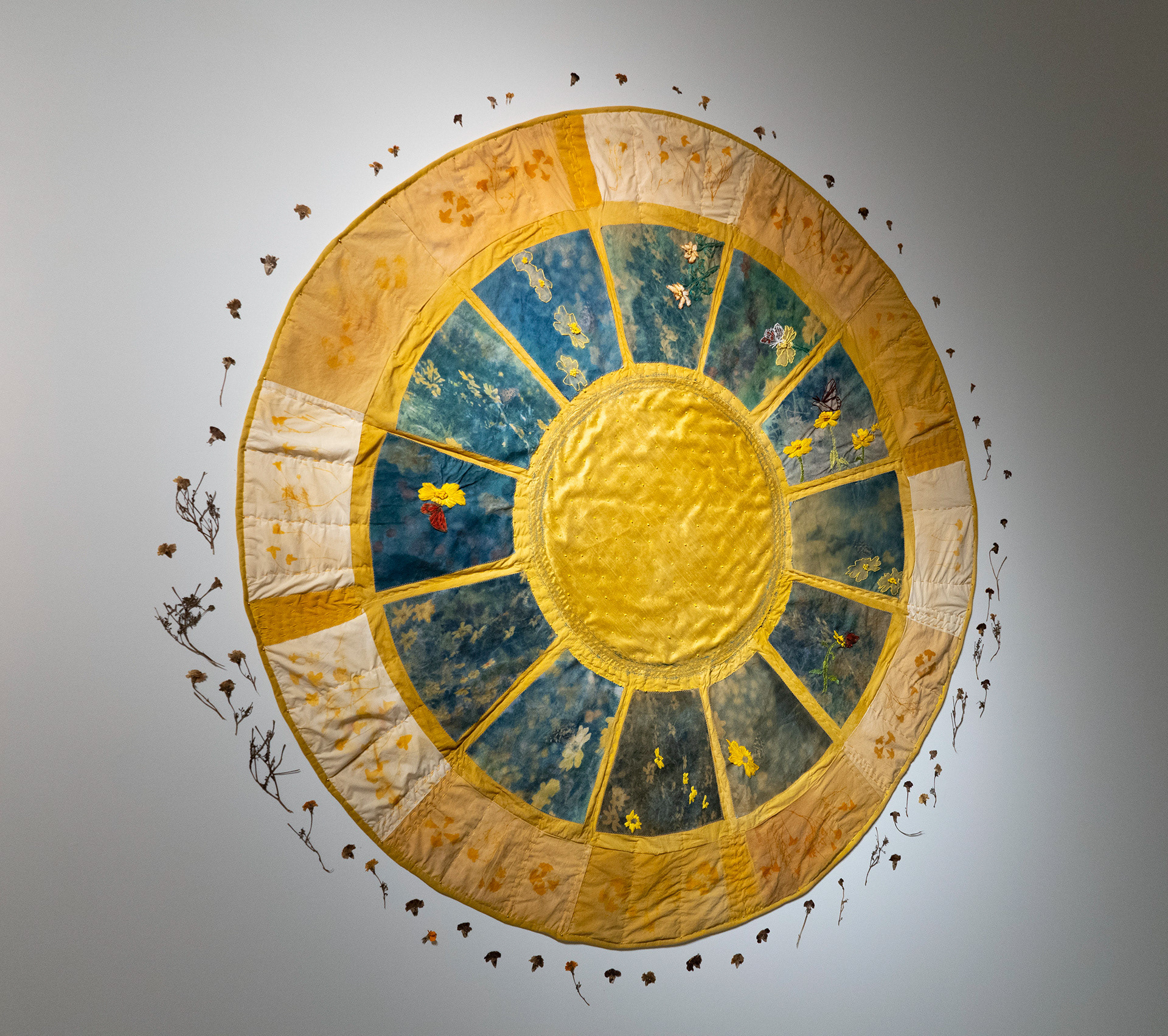 Quilt Sculpture, Morning Light, 2020, Cotton Dyed with Natural Materials, Flowers, Thread, Wooden Dowels, Steel